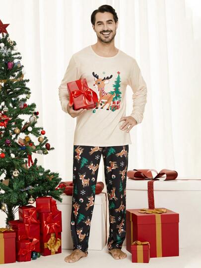 男士圣诞亲子睡衣套装(2件套),包含一件印有小鹿和圣诞树图案的长袖上衣和一条长裤,适合节日休闲穿着,秋冬季服装。 - 杏色 - 查看 4