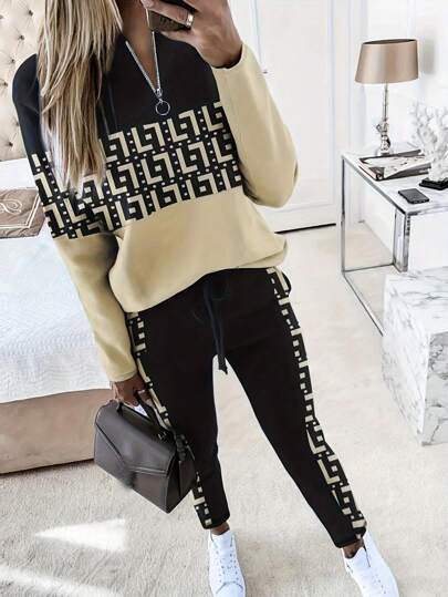 2 件套撞色印花拼布长袖上衣和松紧腰长裤 - 黑色 - 查看 1