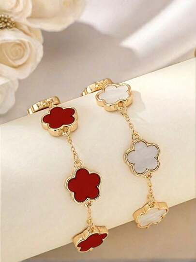 2 件/套时尚经典款黑色、白色、绿色三叶草手链套装情人节、妈妈、母亲、母亲节、礼物 - 白紅 - 查看 1