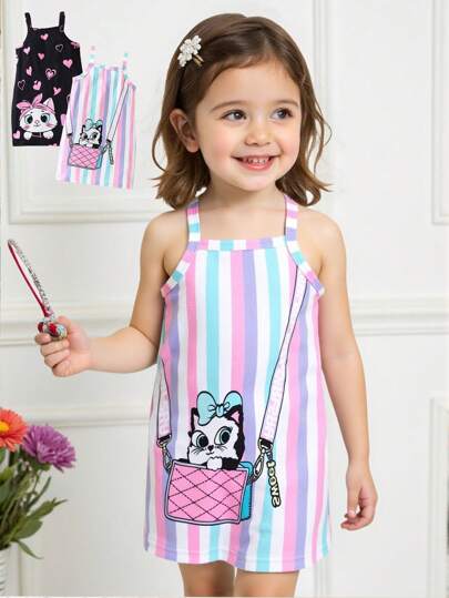 2 件套女孩夏季休闲甜美印花无袖修身腰连衣裙,适合居家和户外穿着 - 彩色 - 查看 2
