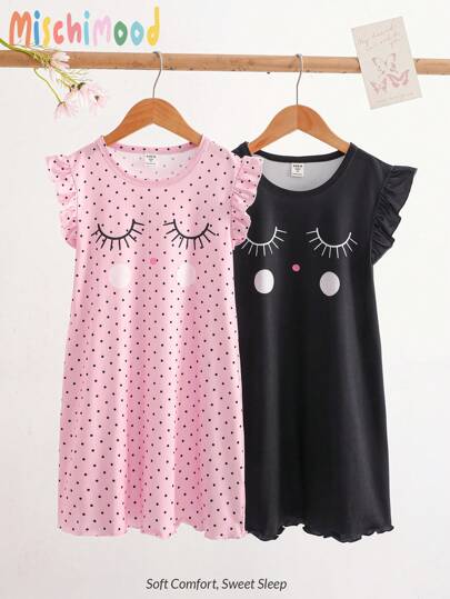 2件套女童无袖荷叶边休闲长款睡衣套装,春夏睡衣 - 黑色 - 查看 2
