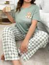 Pop Mart Azura X SHEIN 大码女式卡通字母印花插肩袖 T 恤和短裤睡衣套装,夏季