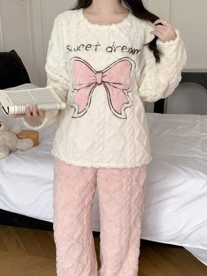 SHEIN 2 件套青少年女孩双面蝴蝶结贴花刺绣圆领长袖上衣和裤子休闲睡衣套装 - 粉色 - 查看 1