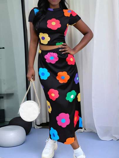 2 件套青少年女孩休闲度假彩色花朵印花圆领短袖短款上衣和修身长款针织裙套装 - 黑色 - 查看 2