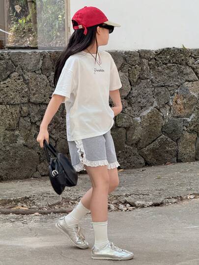 DAZY 2 件套青少年女童休闲字母印花短袖上衣和短裤套装,女童夏季服装,返校服装 - 白色 - 查看 2