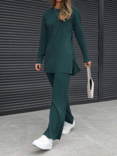 EURMUSE 2 件套女士纯色圆领长袖基本款上衣和裤子休闲套装 - 墨綠色 - 查看 1