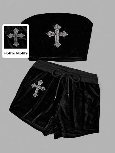 ROMWE Goth Y2K 风格性感十字水钻天鹅绒抹胸和抽绳天鹅绒短裤 2 件套女士 - 黑色 - 查看 1