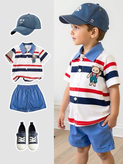 SHEIN 2 件套年轻男孩夏季短袖 Polo 领单排扣卡通熊条纹衬衫上衣和牛仔效果短裤套装,适合上学、休闲装和外出 - 彩色 - 查看 1