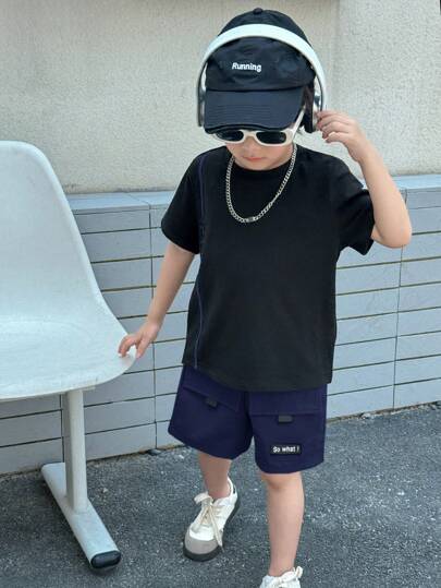2 件套年轻男孩休闲百搭圆领 T 恤和霓虹绿色工装短裤,适合春夏季、日常穿着、运动、外出、学校、派对、节日、摄影 - 藏蓝色 - 查看 2
