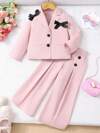 2 件套年轻女孩休闲可爱优雅蝴蝶结装饰粉色衬衫和裤子套装,秋冬