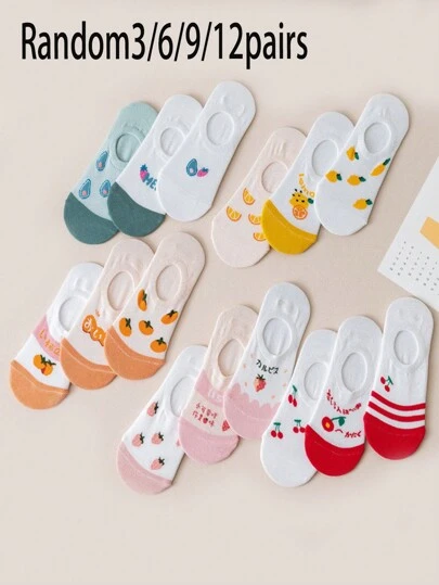 3/6/9/12 双女士可爱卡通网眼浅袜,百搭简约春夏新品彩色水果印花图案低帮隐形船袜,舒适柔软透气吸汗适合日常、休闲、校园风格、运动使用、所有季节、随机搭配 - 彩色 - 查看 6