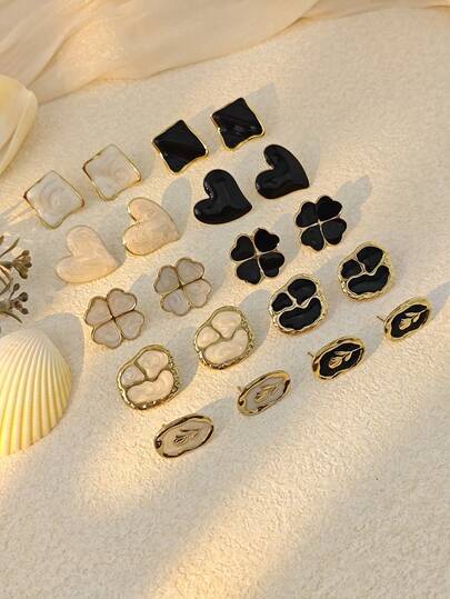 三对随机组合耳环套装,包括白色、黑色不锈钢几何方形耳环、不规则花朵耳环、心形耳钉,复古珠宝,夏季沙滩泳装配饰,时尚吸睛配饰