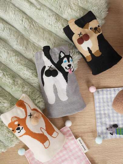 3双装女士卡通趣味小狗设计休闲可爱情侣中筒袜,日常百搭(随机发货) - 彩色 - 查看 3