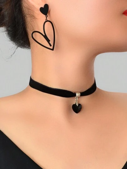 3 件复古心形吊坠黑色天鹅绒颈链心形吊坠耳环派对首饰套装情人节、妈妈、母亲、母亲节、礼物 - 黑色 - 查看 1