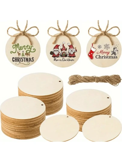 30/60 件未完成木环,带预钻孔 - 3 英寸/7.5 厘米天然木片,带 10 米绳,适用于 DIY 工艺品、礼品标签、圣诞装饰和节日家居装饰 - 杏色 - 查看 7