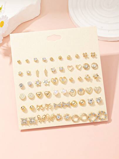 30对金属水钻和仿珍珠心形蝴蝶结花朵耳钉套装,适合日常佩戴,可作礼物 - 金黃色 - 查看 6