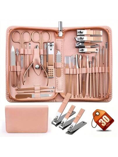 30 件经典修甲和修脚套装,含不锈钢指甲刀、角质层钳、镊子、指甲锉、凹刃 - 无香手部、足部、面部护理工具,带 PU 皮盒 - 彩色 - 查看 10