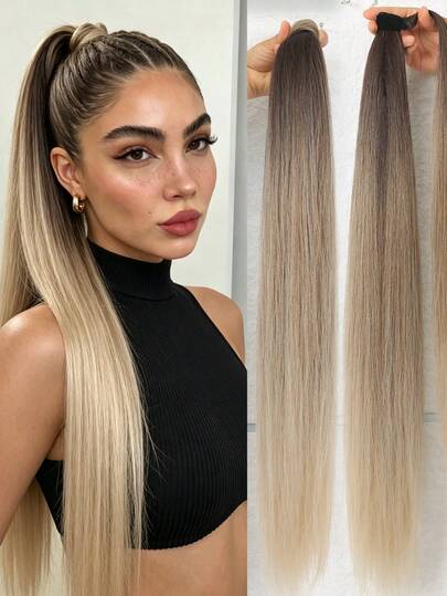 32英寸马尾接发,夹式马尾接发,环绕式长直发钩环马尾接发,有黑色/棕色/灰色/金色可选,女士适用。