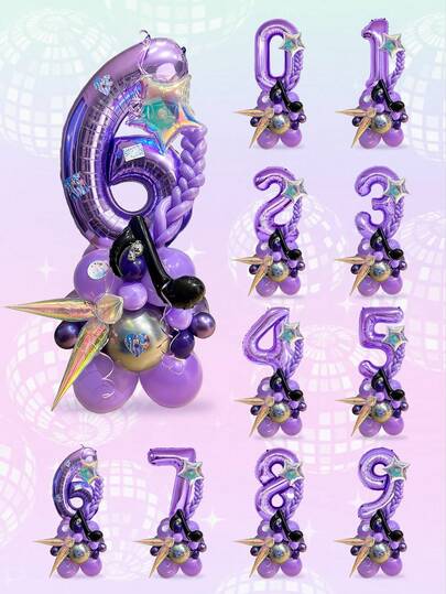 33件套韩流音乐主题生日气球柱套装,包含音符气球、32英寸紫色数字0-9气球、彩色爆炸星气球,适用于韩流音乐主题生日派对装饰、男孩女孩生日派对短视频装饰、青少年生日派对、卡拉OK音乐主题装饰、80年代迪斯科主题生日派对、星空主题舞会、新年舞会庆祝活动用品。 - 彩色 - 查看 1