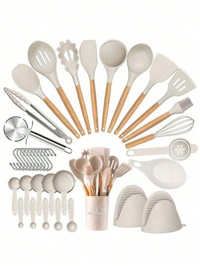 36入組矽膠廚房烹飪用具,具有木手柄的耐高溫烹飪工具套裝,不粘烹飪小工具,包括刮板匙,披薩刀,清理廚房配件家居廚房用品 - 卡其色 - 查看 1