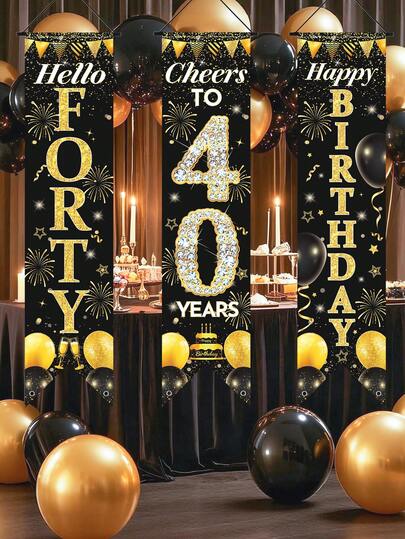 3件套40岁生日黑金门牌,闪亮40岁生日快乐门柱对联,125*30厘米涤纶悬挂横幅,40岁生日派对装饰,生日悬挂旗帜,生日庆祝用品,生日派对背景装饰,生日家居装饰,庭院装饰