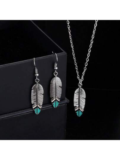 3 件波西米亚风羽毛项链长羽毛吊坠项链链金银叶项链复古甲板形耳环首饰套装适合女士和女孩 - 耳環+項鍊套件 - 查看 1