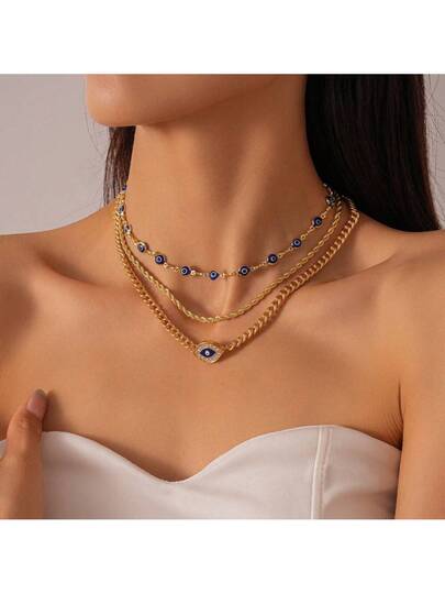 3pcs Artistic Stacking Three-Piece Necklace, Diamond-Encrusted Dripping Geometric Eye Necklace, Light Luxury Niche Design, A Set Unlocks A Variety Of Retro Shapes