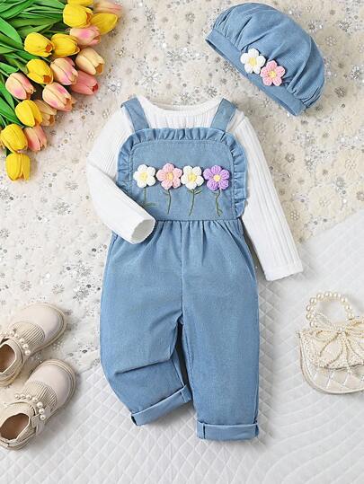 3 件套女婴甜美风格白蓝圆领长袖上衣、围兜裤、配套帽子套装,适合外出、休闲装、儿童派对 - 藍色 - 查看 3