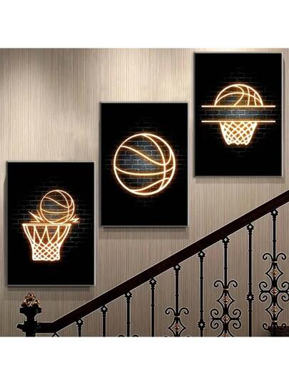 3入組籃球主題牆藝海報和印刷品,霓虹燈帆布畫,現代藝術品,青少年男孩房間裝飾,30cm×40cm,無框裝 - 杏色 - 查看 3