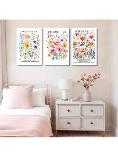 3 件基督教水彩野花帆布墙艺术圣经诗句墙饰图片植物花卉海报印刷品适用于女孩房间客厅卧室装饰可直接悬挂,高端氛围壁画 - 带框三件套墙面画 - 彩色 - 查看 1