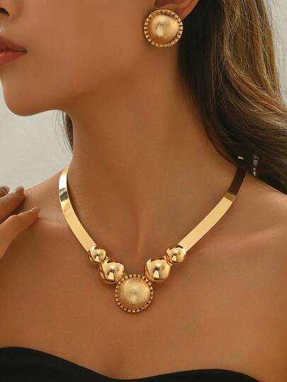 3 件套优雅 V 形和圆形几何项链套装,金属金色颈链,耳钉,百搭欧式珠宝套装 - 金黃色 - 查看 1