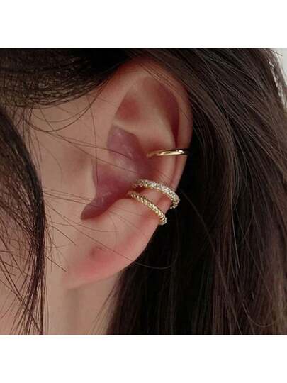 3 件时尚简约 C 形水钻夹式耳环套装,适合女士、约会、派对、日常、情人节礼物 - 金黃色 - 查看 1