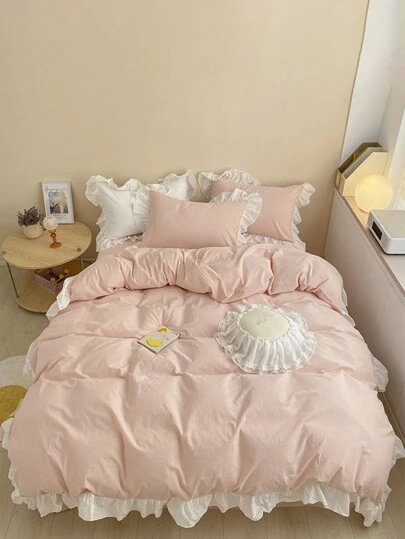 3 件套花卉荷叶边床上用品套装,开学季粉色 - 粉色 - 查看 7