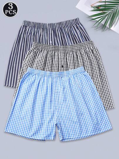 3条装男士经典格子条纹休闲平角内裤 - 彩色 - 查看 3