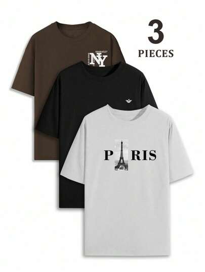 3 件男士字母印花圆领短袖休闲 T 恤,夏季 T 恤 - 彩色 - 查看 1