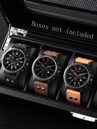 3 件男士石英表套装:经典仿皮表带、圆形表盘、耐用设计 - 送给他的完美礼物 - 彩色 - 查看 1