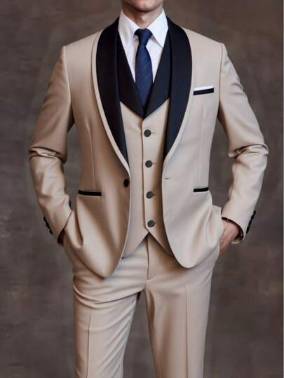 男士修身披肩领单排扣西装三件套,包含配套马甲和西裤,新郎婚礼礼服及伴郎正式服装 - 卡其色 - 查看 1