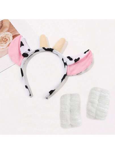3 件装毛绒大耳朵黑白牛头带 + 腕带,女士动物服装头饰,适合万圣节、派对、四季舞会 - 彩色 - 查看 1