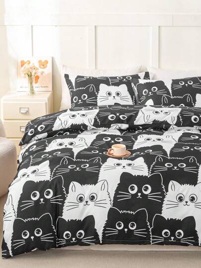 3 件套卡通猫图案羽绒被套套装(1 件羽绒被套和 2 件枕套),适合所有季节的可爱布艺床上用品套装 - 彩色 - 查看 6