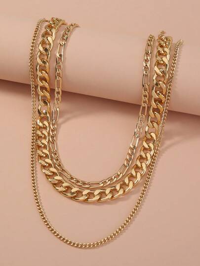 3 件套金色多层粗链项链套装,女士时尚朋克嘻哈风格多层链项链礼物(链条、圆扣和珠子数量随机) - 金黃色 - 查看 1
