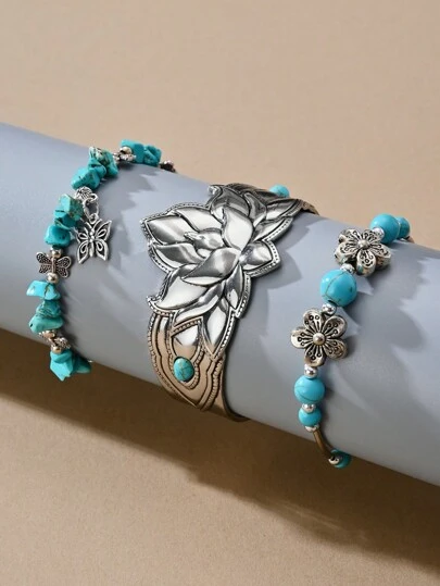 3入組多彩波西米亞風格珠飾手鐲和項鍊,附有綠松石、蓮花、大象、蝴蝶吊墜,是假日情侶送禮的完美選擇
