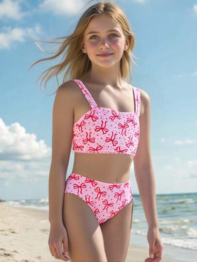 3 件套 Tween 女童蝴蝶结印花吊带背心上衣和泳裤分体泳衣套装 - 彩色 - 查看 1
