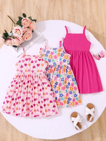 3 件套年轻女孩休闲罗纹露肩连衣裙,粉色、紫红色、花朵印花,适合派对、休闲、旅行、家居服、夏季 - 彩色 - 查看 3