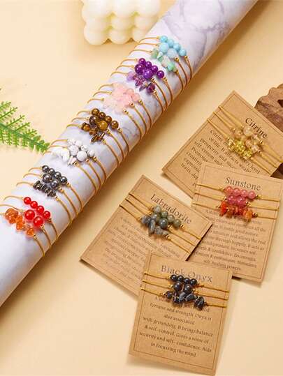 3 件石手鍊套裝:黃水晶、晶和混合石串珠手鍊,配有手工編織銅珠 - 黑色 - 查看 3