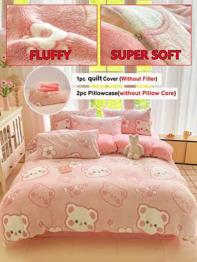 3 件套加厚保暖双面羊毛床上用品套装 - 绿心 + 卡通熊印花图案 | 1 件羽绒被套,2 件枕套,不含被子或枕头 | 舒适温暖透气,冬季必备床上用品 - 甜心小熊 - 查看 3