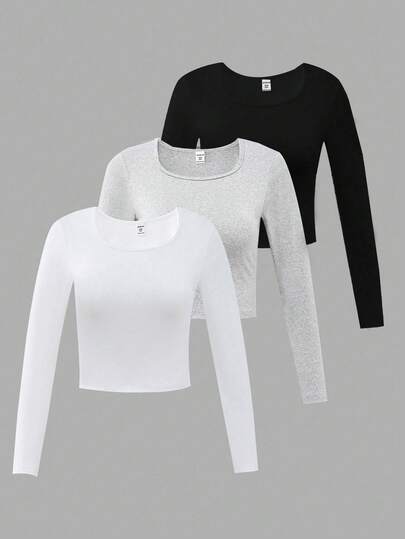 3 件装 Tween Girl 休闲 V 领长袖 T 恤套装(黑色、白色、灰色) - 彩色 - 查看 3