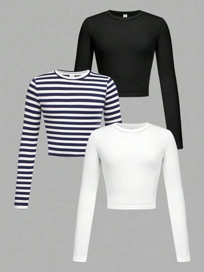 SHEIN 3 件装 Tween Girls 秋冬休闲条纹纯色圆领长袖 T 恤分层套装 - 藏蓝色 - 查看 3