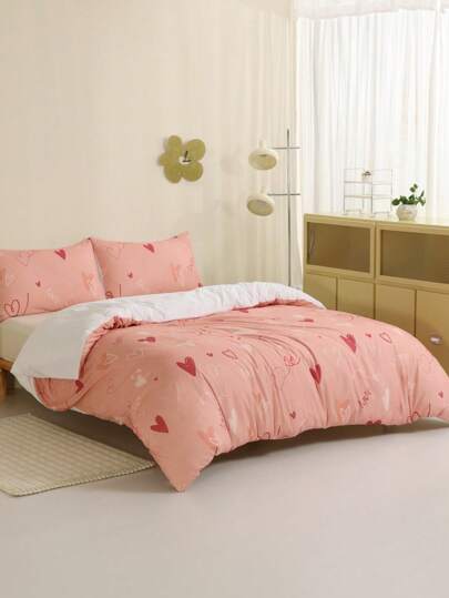 3入組情人節抗菌和絨毛洗滌床上用品套件,心形印花被套和2個靠墊套,帶拉鍊和角落綁帶,全尺寸或女王尺寸