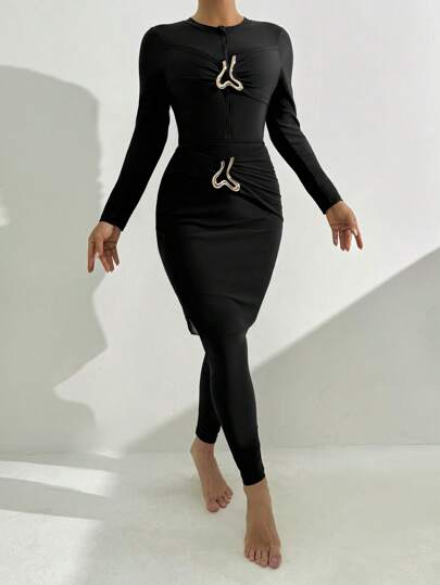 Swim Mulvari 3 件女士金属装饰纯色布基尼套装,适合海滩 - 黑色 - 查看 2
