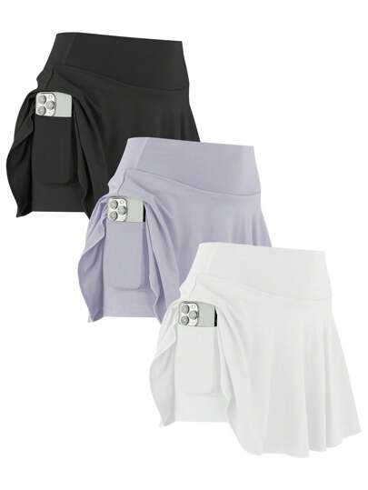 3 件套女士运动裙套装,休闲高腰运动裤,带口袋跑步裙,二合一 - 彩色 - 查看 3